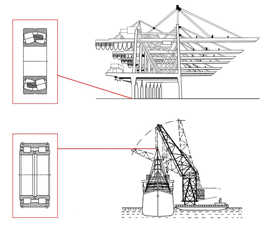 起重運輸機械的工作特點是間歇性運動,各機械經常處于啟動、制動和正反向運轉的工作狀態(tài),其運行速度雖然不高,但經常承載重載,且長期在粉塵或海水潮濕腐蝕等惡劣環(huán)境下連續(xù)工作,要求設備必須具有高效、連續(xù)、穩(wěn)定、可靠、易維護和長壽命等特點,相應對配套軸承提出低速、重載、高可靠性及長壽命的要求。目前軸承主要應用于齒輪箱、行走機構、起升機構、變幅機構、回轉機構等。