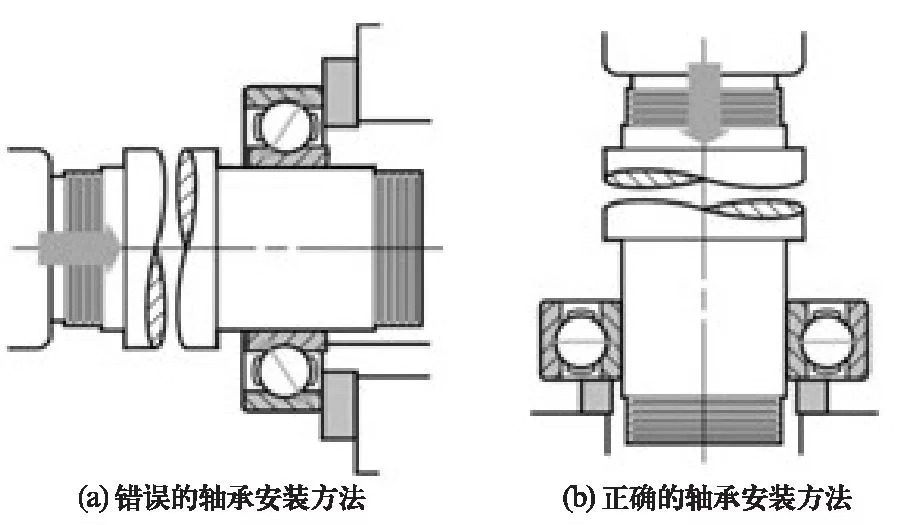 軸承安裝裝反了,不僅軸承工作不正常,且各配合面會遭到嚴(yán)重磨損。由于軸圈與座圈和區(qū)別不很明顯,裝配中應(yīng)格外小心,不能裝反。