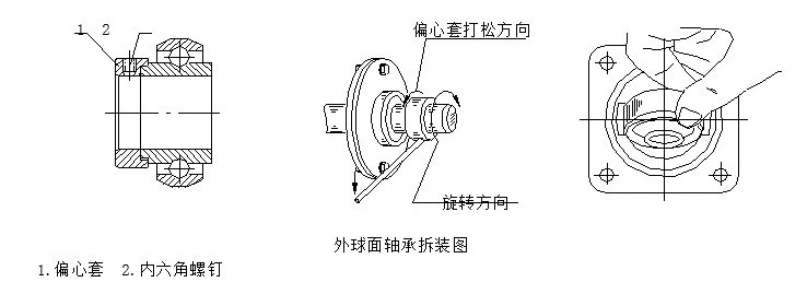 1. 軸承上帶有偏心套時先擰松偏心套上鎖緊螺釘,然后用小鐵棍插入或頂著偏心套上的沉孔,逆著軸的旋轉(zhuǎn)方向打松偏心套(見圖)。